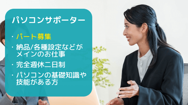パソコンサポーター(パート)/納品設置・各種設定・OA機器提案・フォローがメインのお仕事